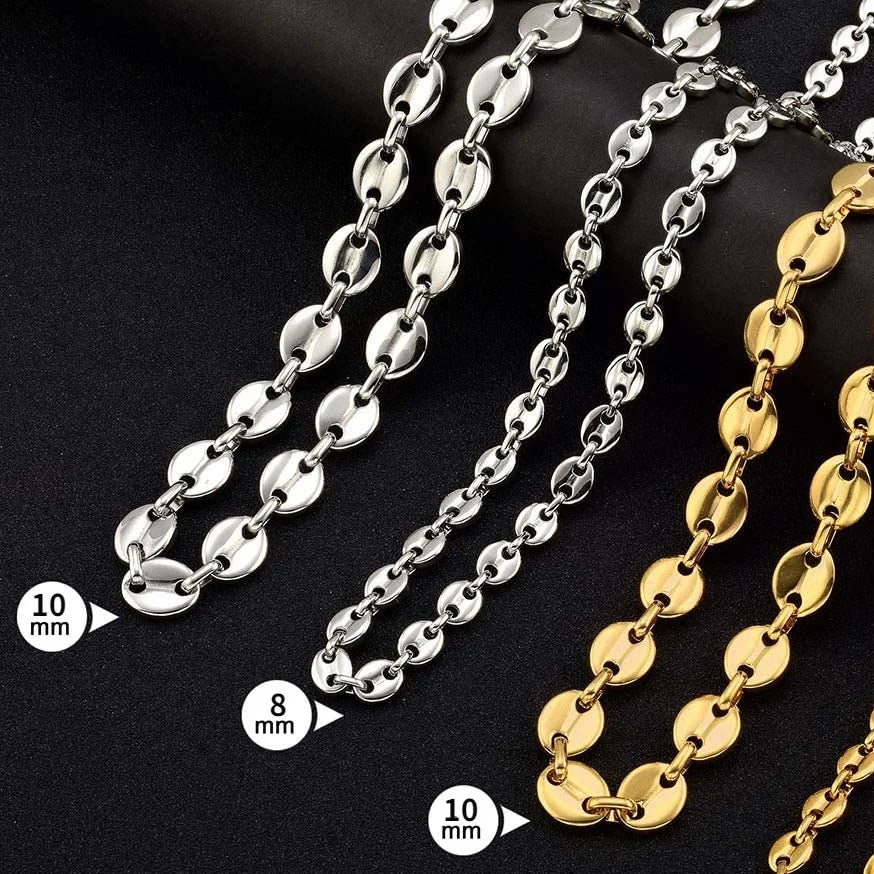 Fabricada en acero inoxidable de alta calidad, la cadena es duradera, resistente al desgaste y conserva su brillo durante mucho tiempo.